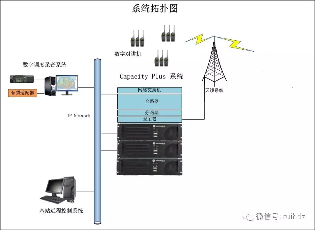 Capacity Plus多信道無線對講系統(tǒng)--數(shù)字無線集群通信系統(tǒng)由數(shù)字基站、數(shù)字對講終端、數(shù)字調(diào)度錄音系統(tǒng)組成,其中數(shù)字中繼臺、數(shù)字調(diào)度錄音系統(tǒng)、基站遠程控制系統(tǒng)接入到IP Network中。